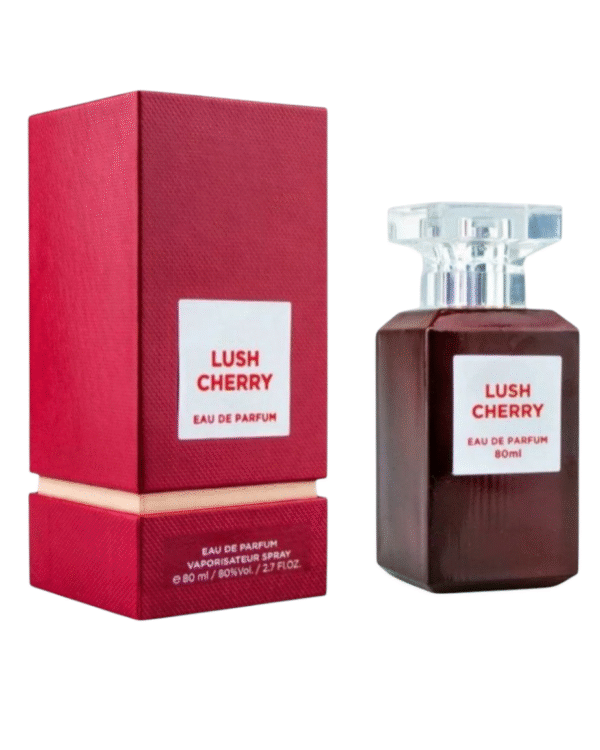Lush Cherry de Fragrance World es una fragancia de la familia olfativa Oriental Floral para Hombres y Mujeres. Lush Cherry se lanzó en 2023. Las Notas de Salida son Cereza negra, Cherry Liqueur y almendra amarga; las Notas de Corazón son cereza ácida (guinda), ciruela, rosa turca y jazmín sambac (sampaguita); las Notas de Fondo son vainilla, haba tonka, benjuí, bálsamo del Perú, sándalo, canela, cedro, pachulí, vetiver y clavos de olor.